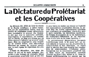 Dans le Bulletin communiste « organe [en langue française] du comité de la Troisième internationale » du 27 mai 1920, Miasnikov 1 publie un article sur La dictature du prolétariat et les coopératives. Il rappelle, après avoir dénoncé la politique de capitulation des mencheviques, que dès 1907, les bolcheviques de Moscou et Petrograd se battaient pour que « les magasins et les boulangeries soient organisés par les organes officiels des villes pour le bien commun et placés sous le contrôle de représentants ouvriers ». Dans des usines des résolutions votées indiquaient alors que « bien que nous reconnaissions que l’affermissement du mouvement politique soit la tâche principale du moment, nous mettons en garde contre l’emballement pour les coopératives de consommation. Nous sommes contre leur fondation dans des endroits où il n’y a pas de mouvement de masse en leur faveur ». Selon Miasnikov, le mouvement coopératif d’avant 1917 était en fait « la dernière forteresse de la réaction » et qu’il convenait par conséquent de le subordonner au nouveau pouvoir soviétique. C’est la lecture qu’il fait du décret du 11 avril 1918 que Lénine évoque plus haut. Cependant il reconnaît qu’il fallait trouver un « modus vivendi pour les organes coopératifs » car « avant tout un organe si fort et si éprouvé de la répartition des biens économiques tel que les coopératives de consommation devaient être nécessairement utilisées pour la reconstruction socialiste du pays ». Il se félicite du décret 20 mars 1919, qui selon lui, procède à « l’incorporation du mouvement coopératif aux institutions officielles prolétariennes générales » même s’il persiste à caractériser les coopératives comme la troisième forme du mouvement ouvrier aux côtés des syndicats et des partis.